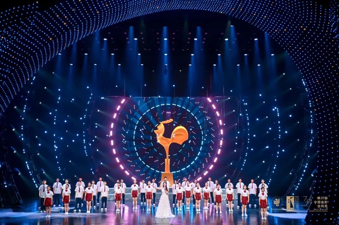 開幕式的舞臺設(shè)計融入“電影是光影藝術(shù)”的理念,采用9000顆數(shù)控燈珠展現(xiàn)電影節(jié)主視覺,視覺效果夢幻靈動。開幕式分為時代之詩、人民之詩、藝術(shù)之詩版塊,舞蹈《綻放》、阿卡貝拉《夢想清單》、音樂劇《唱響金雞》、詩朗誦《祖國啊 我親愛的祖國》和合唱《我愛你中國》等節(jié)目精彩紛呈。