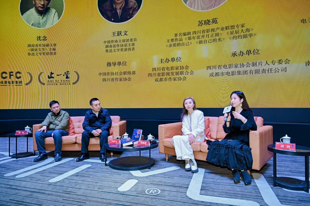12月29日19:00,“跟著‘大家’看電影”項(xiàng)目第三期活動(dòng)在成都新明電影院5號(hào)廳如期舉行,豪華的嘉賓陣容吸引了約200名觀眾參與這場(chǎng)文學(xué)與影視融合的文化盛宴。本次活動(dòng)由中國(guó)作協(xié)主席團(tuán)委員、湖南省作協(xié)原主席、魯迅文學(xué)獎(jiǎng)得主王躍文擔(dān)任主講嘉賓。同樣是魯迅文學(xué)獎(jiǎng)得主,湖南省作協(xié)副主席、《湖南文學(xué)》主編沈念;擁有《那年花開(kāi)月正圓》《星辰大?!贰蹲鲎约旱墓狻贰蹲谱粕厝A》等作品的著名編劇蘇曉苑擔(dān)任對(duì)談嘉賓。青年評(píng)論家、成都電子科技大學(xué)文學(xué)院副教授、文學(xué)博士邱田擔(dān)任學(xué)術(shù)主持。